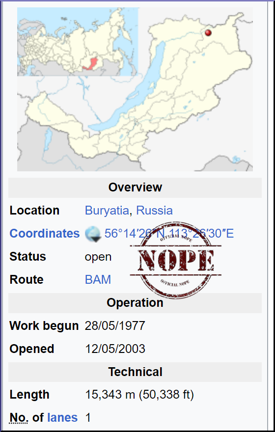 The Severomuysky Tunnel (Russian: Северому́йский тонне́ль) is a railroad tunnel on the Baikal Amur Mainline (BAM), in northwestern Buryatia, Russia. It is named after the Northern Muya Range it cuts through. The tunnel is 15.34 kilometres (9.53 mi) long, the longest in Russia (excluding metro lines).