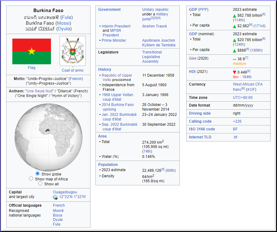 The 2018 CIA World Factbook provides this updated summary. “Burkina Faso is a poor, landlocked country that depends on adequate rainfall. Irregular patterns of rainfall, poor soil, and the lack of adequate communications and other infrastructure contribute to the economy’s vulnerability to external shocks. About 80% of the population is engaged in subsistence farming and cotton is the main cash crop. The country has few natural resources and a weak industrial base. Cotton and gold are Burkina Faso’s key exports.”