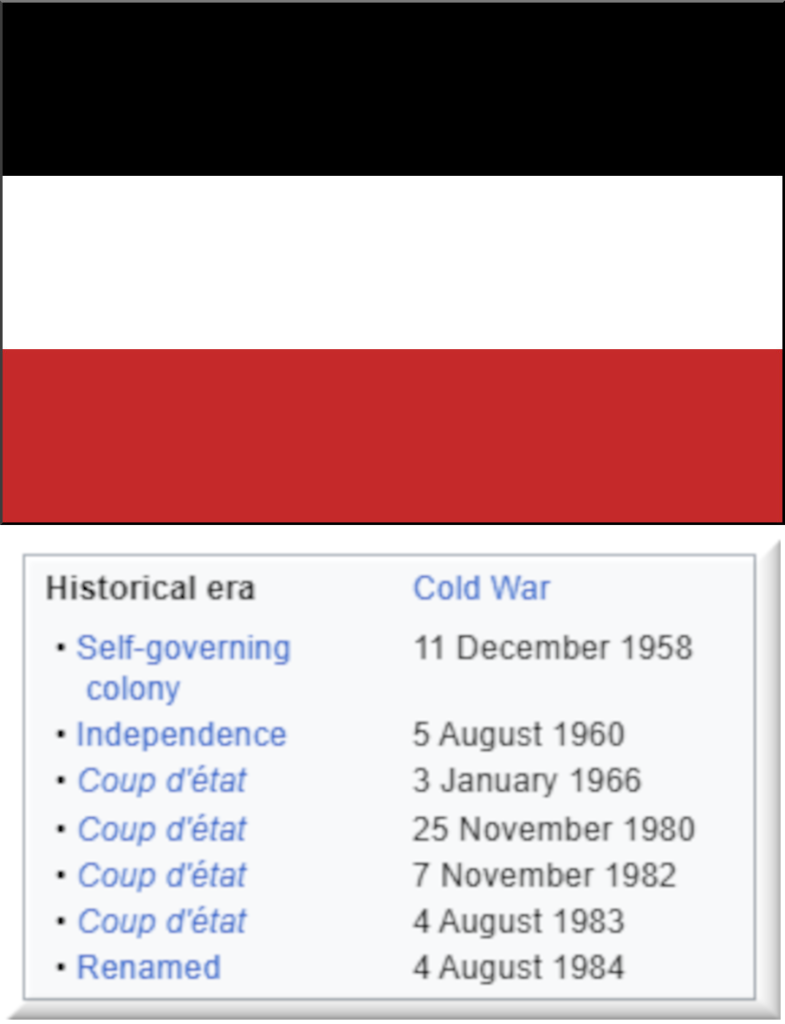 The Republic of Upper Volta (French: République de Haute-Volta) was a landlocked West African country established on 11 December 1958 as a self-governing state within the French Community. Before becoming autonomous, it had been part of the French Union as the French Upper Volta. On 5 August 1960, it gained full independence from France. On 4 August 1984, it changed its name to Burkina Faso. – Wikipedia