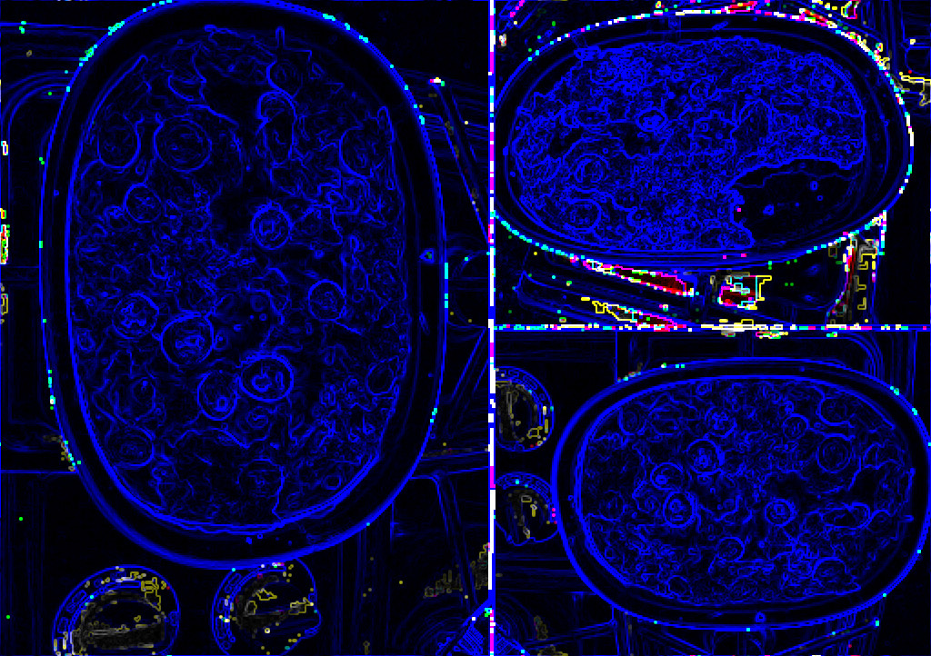 Color-enhanced to show pockets of Escherichia coli (E. coli) bacteria (blue):