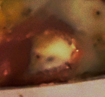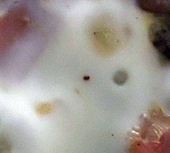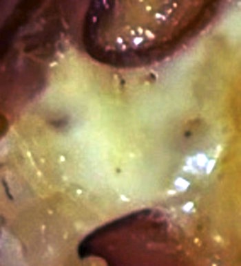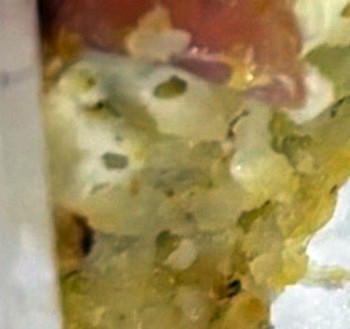 Color-enhanced to show pockets of salmonella bacteria (green):