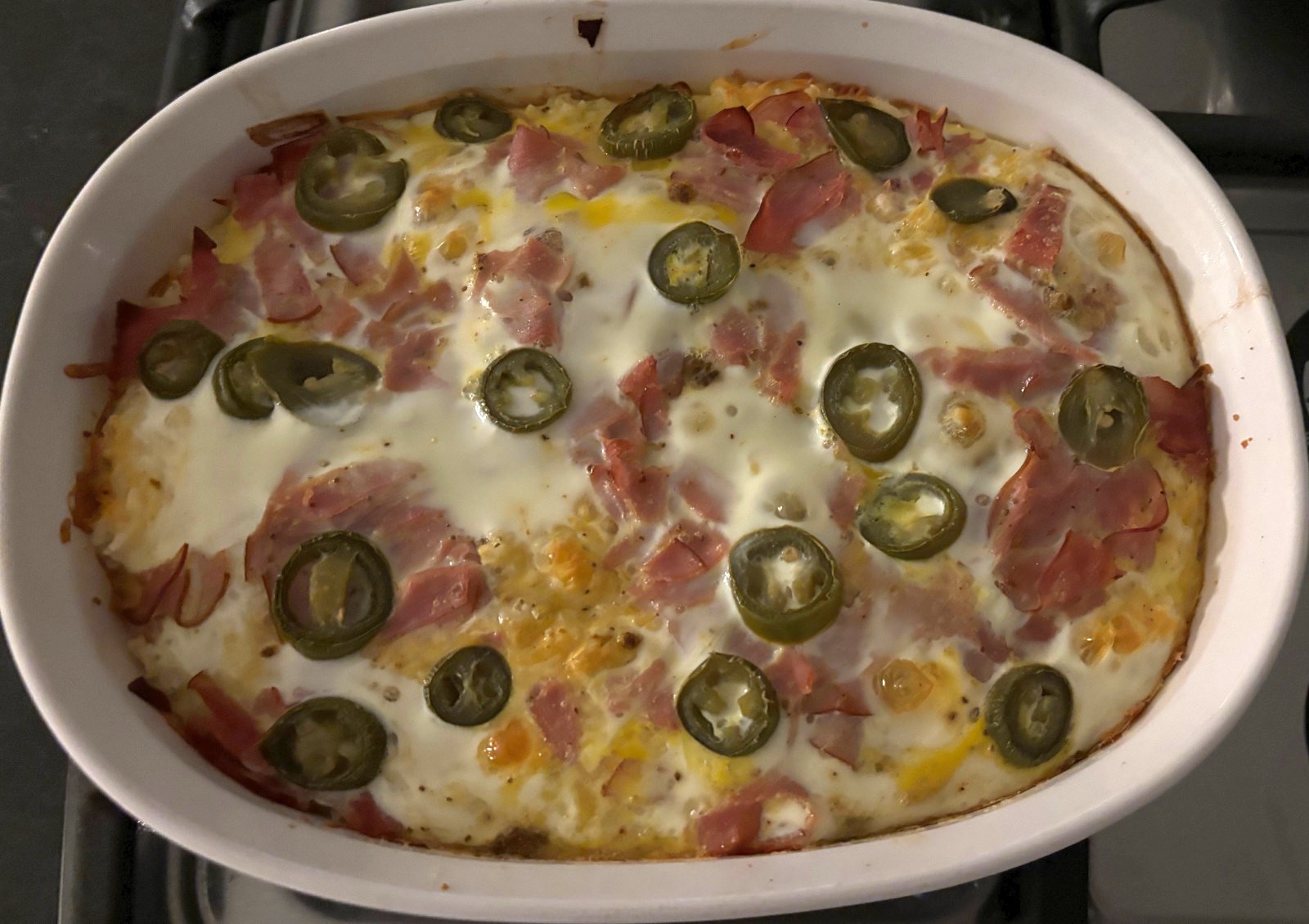 Up with jet lag. Cleaned out eggs, cheese, rice, jalapeño and dubious ham from fridge and baked it up.