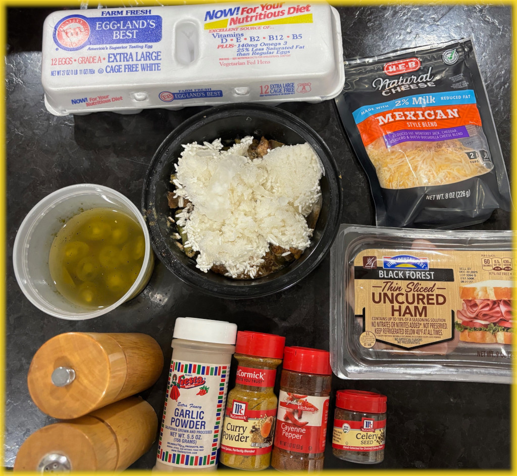 Keeping with my mission to keep food waste from landfills and to test the scientific fact that you won’t get sick from spoiled food cooked above 165F (75C) to kill bacteria, I cooked a refrigerator casserole based on old food (been in Japan for two weeks). Ingredients included 3 week old rice, 3 week old eggs, cheese not yet molded, salt, pepper, cayenne pepper, garlic powder, celery seed, pickled jalapeños and curry powder. Mixed lightly and cooked in 350F (175C) oven for 49 minutes. Houston Police toxicology lab has not yet been called.