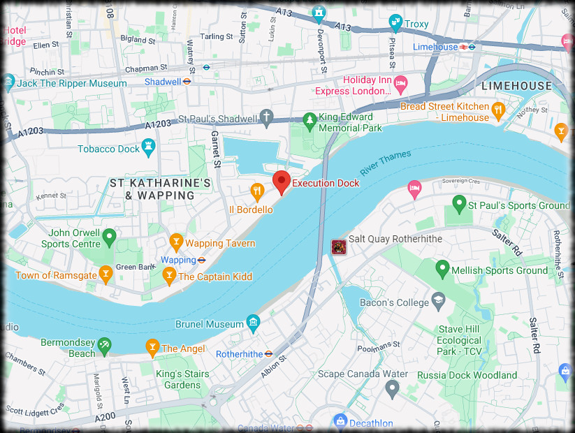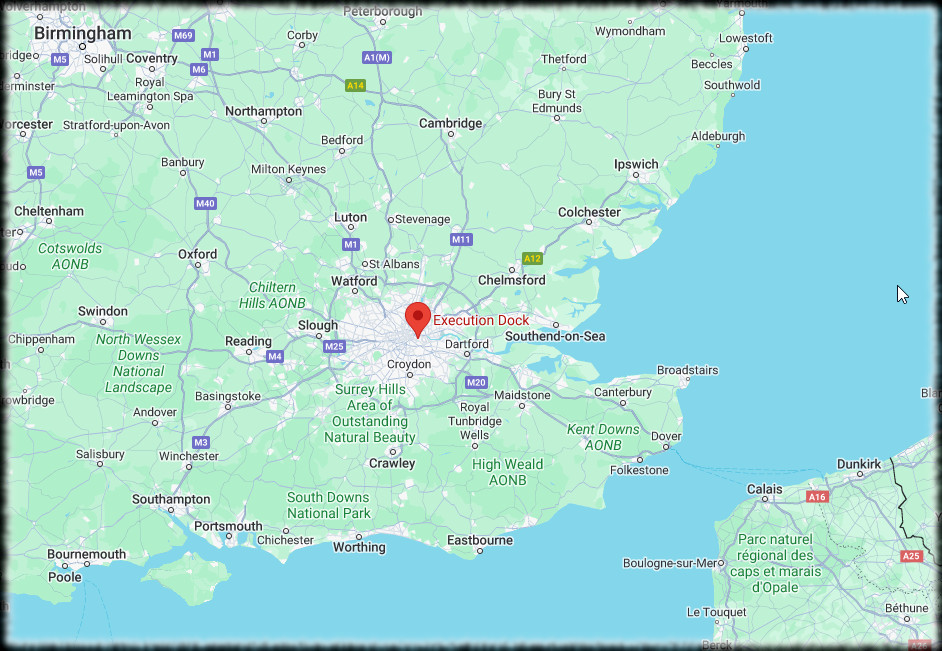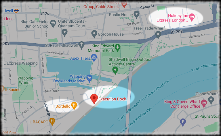 Execution Dock was a place in the River Thames near the shoreline at Wapping, London, that was used for more than 400 years to execute pirates, smugglers and mutineers who had been sentenced to death by Admiralty courts. The “dock” consisted of a scaffold for hanging. Its last executions were in 1830.