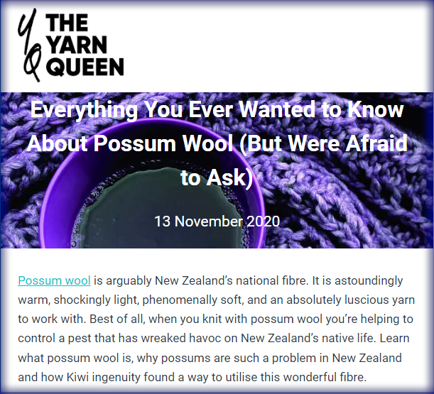 Howdy – I hope everyone had a good Boxing Day. Our son who just returned from New Zealand gifted me with a wonderful sweater made with 40% possum fur – this has to be worthy of incorporating into the WLBOTT tour – how to they shear the possums to get the wool?