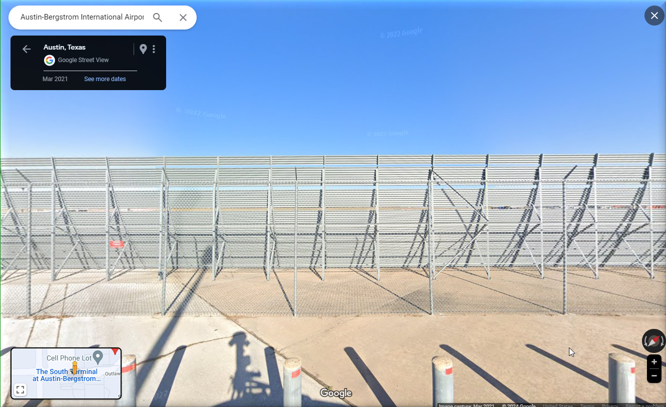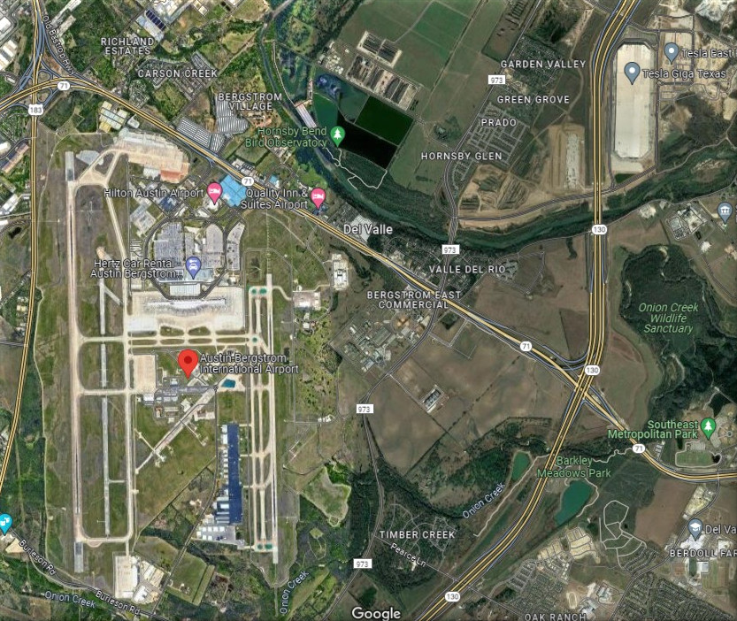 By contrast, pix of Austin’s airport (AUS) has both airplanes and the Tesla plant (upper right of image on right). Added bonus, the runways are almost perfectly N-S.