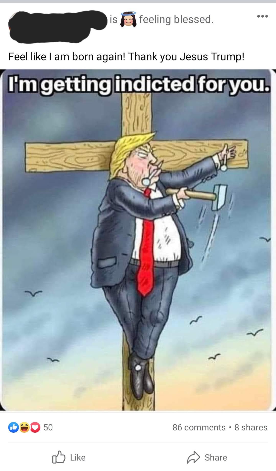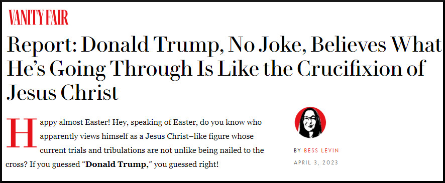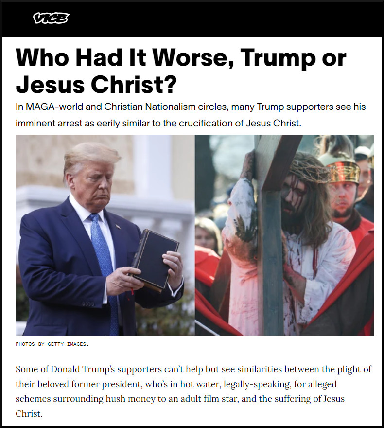 The prosecutions underway against Trump have been easily interpretable as signs of persecution, which can then connect to the suffering Jesus theme in Christianity. Trump has been able to leverage that with lines like, “They’re not persecuting me. They’re persecuting you.” The idea that he is unjustly suffering and, in so doing, vicariously absorbing the suffering that his followers would be enduring is a powerful way for Trump to be identified with Jesus. – New York Times