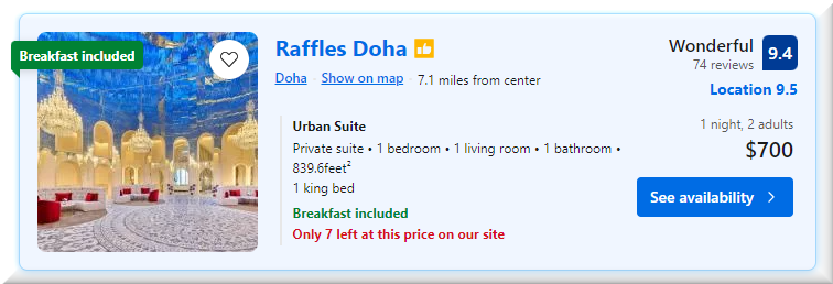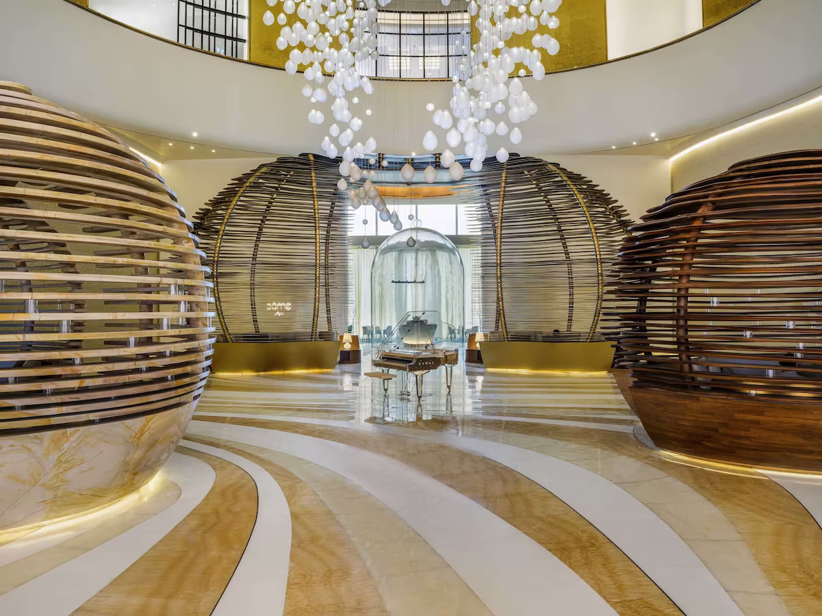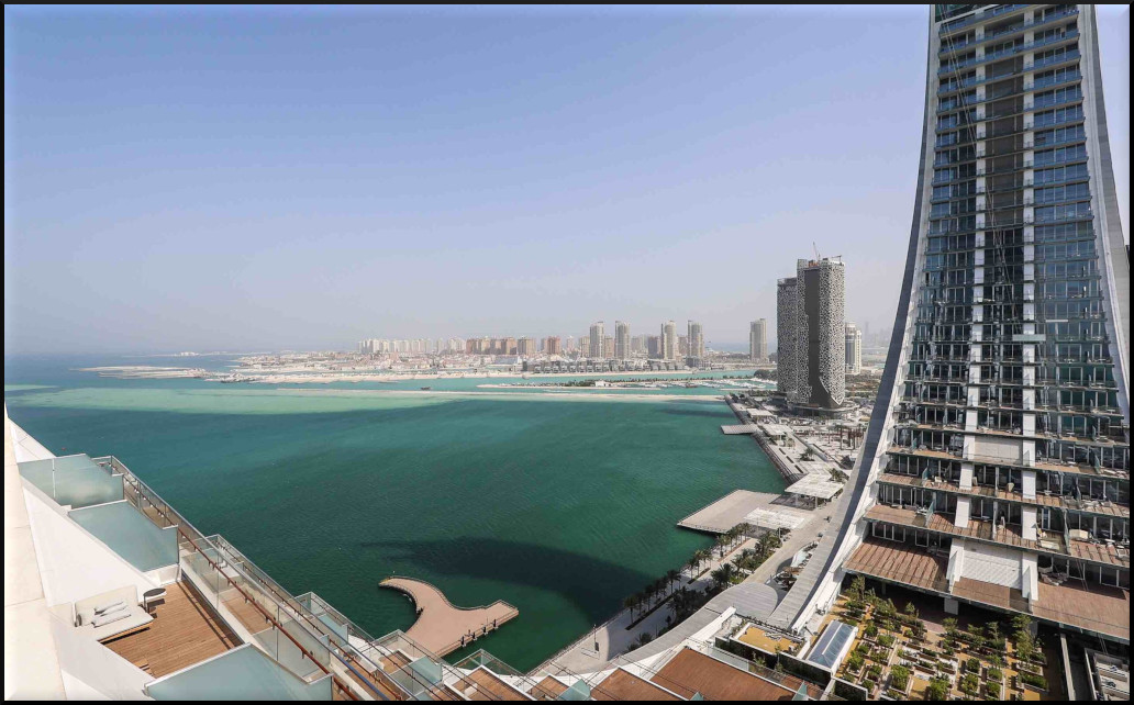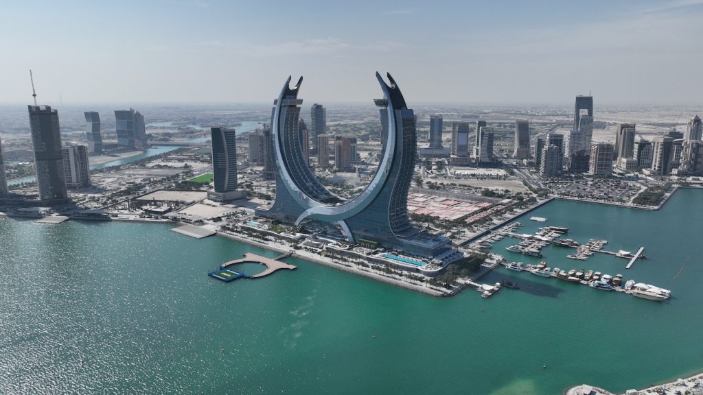 This new addition to the Doha skyline is called Katara Towers and is divided between two hotel brands, the Fairmont and the Raffles. Each occupies one half of the 300,000 square meter building, which is designed to resemble a pair of Qatari crossed scimitars.