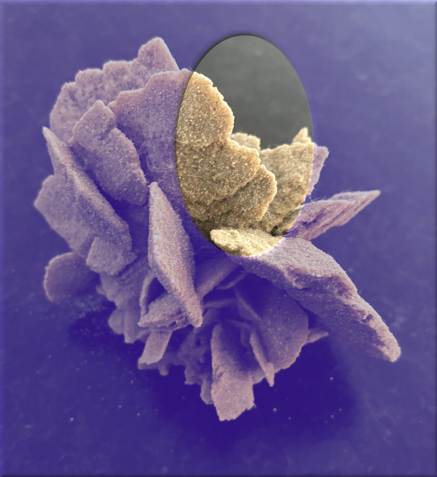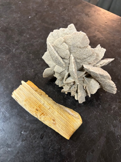 A desert rose is an intricate rose-like formation of crystal clusters of gypsum or baryte, which include abundant sand grains. The “petals” are crystals flattened on the c axis, fanning open in radiating clusters.