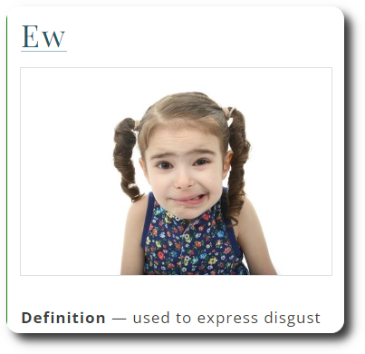 Ew joins another 106 two-letter words, which are aa, ab, ad, ae, ag, ah, ai, al, am, an, ar, as, at, aw, ax, ay, ba, be, bi, bo, by, da, de, do, ed, ef, eh, el, em, en, er, es, et, ex, fa, fe, gi, go, ha, he, hi, hm, ho, id, if, in, is, it, jo, ka, ki, la, li, lo, ma, me, mi, mm, mo, mu, my, na, ne, no, nu, od, oe, of, oh, oi, ok, om, on, op, or, os, ow, ox, oy, pa, pe, pi, po, qi, re, sh, si, so, ta, te, ti, to, uh, um, un, up, us, ut, we, wo, xi, xu, ya, ye, yo, and za. – Merriam-Webster