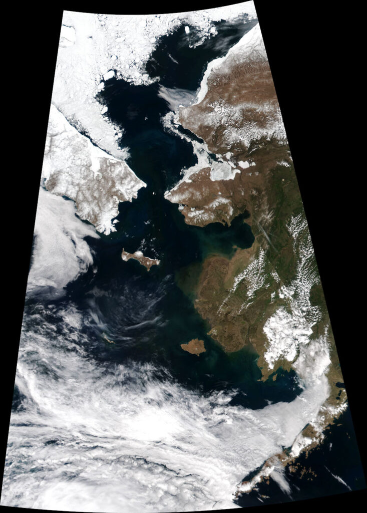 Summer temperatures on the islands average about 40 to 50 degrees Fahrenheit. Wintertime is even colder, averaging between 6 and 10°F. Each year, Arctic sea ice extends southward into the strait from the Bering and Chukchi seas. By June, however, melting usually causes the ice edge to retreat northward, leaving open water that appears black in these images.
