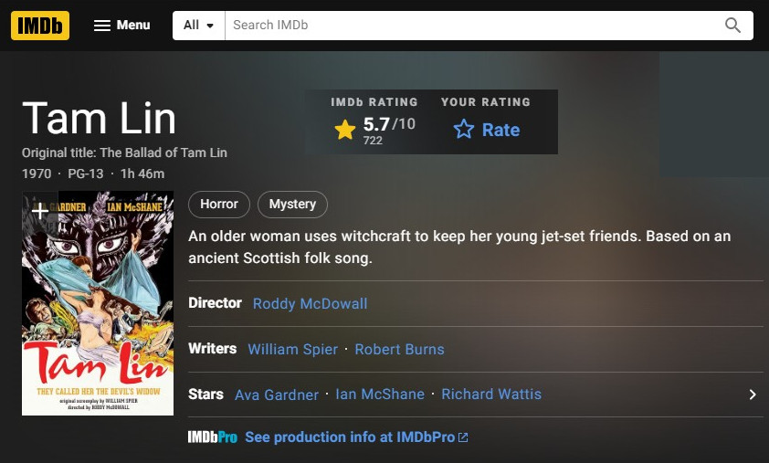 The Ballad Of Tam Lin is no classic but Gardner is perfectly cast as Micky. As marvelously menacing as she is gloriously glamorous, she steals the show but Ian McShane, who looks like a young George Best, shines too and, although in a much smaller role, Richard Watiss is on terrific form.