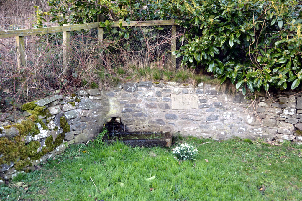 The well, and Tamlane (who was the son of Randolph, Earl of Moray), are both referred to in a ballad by Sir Walter Scott: “Minstrelsy of the Scottish Border, volume 2”. Also referred to from ‘Tam Lin’ by Robert Burns, adding: “Tam Lin was a knight who had been captured by the Queen of the Fairies and was being prepared for sacrifice on Hallowe’en, to pay off the little people’s dues to the devil. He is saved by Janet in a fearless act of bravery and love, holding tightly on to her man as his shape is shifted from poisonous snake to wild animal, through iron and through lead, until eventually emerging as ‘a naked knight’ in her arms.”