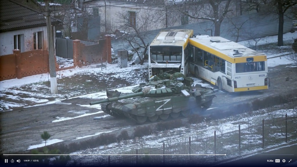 Nothing could epitomize the cruelty and cowardice of the Russians more than the scenes of a tank parked in a city street, the drunk tank commander shooting a civilian apartment building with impunity. (Screen shots from the Frontline documentary)