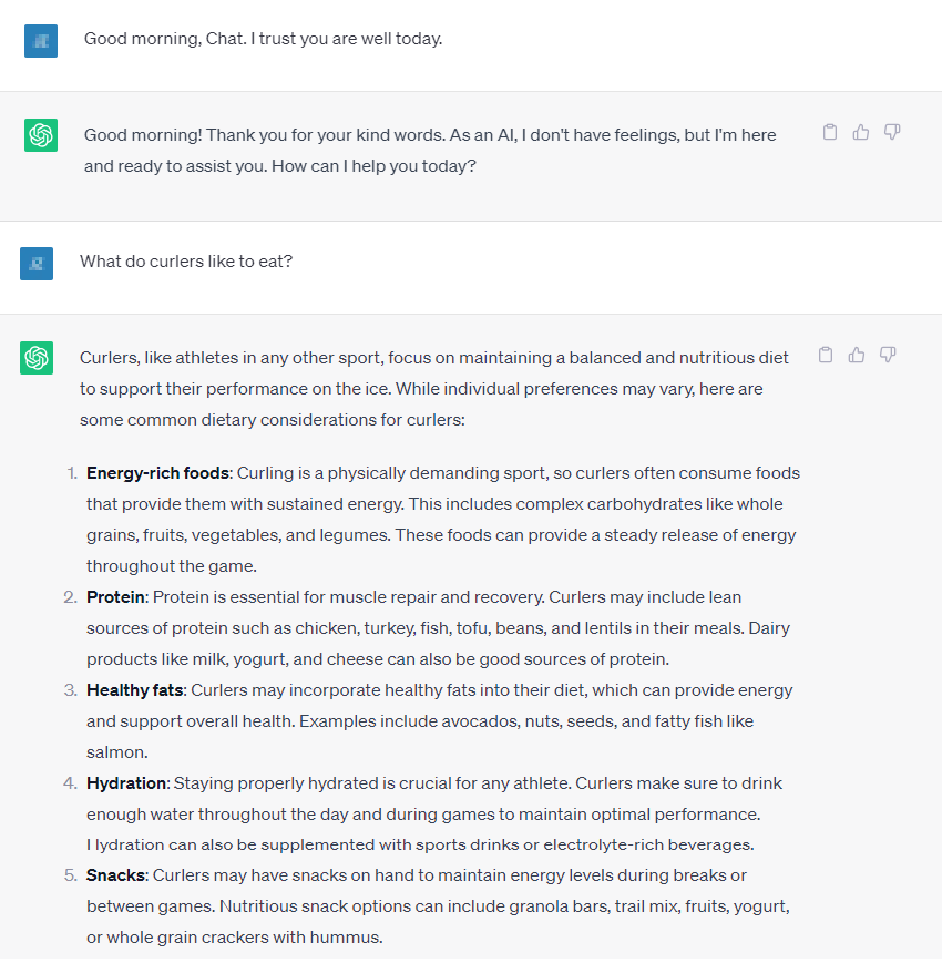 I think my Chat buddy is thinking, “what should curlers eat?” rather than “what do curlers like to eat?”