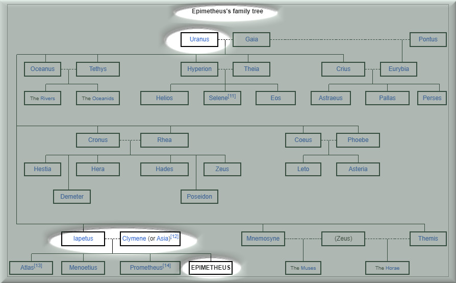 In Greek mythology, Epimetheus (/ɛpɪˈmiːθiəs/; Greek: Ἐπιμηθεύς, lit. “afterthought“) was the brother of Prometheus (traditionally interpreted as “foresight”, literally “fore-thinker”), a pair of Titans who “acted as representatives of mankind”. They were the sons of Iapetus, who in other contexts was the father of Atlas. While Prometheus is characterized as ingenious and clever, Epimetheus is depicted as foolish.