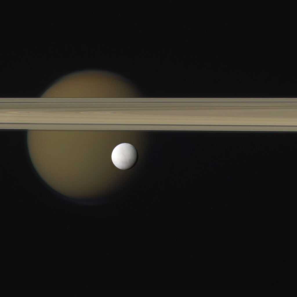 Little Enceladus and enormous Titan are seen on either side of Saturn’s rings in this image, a color-composite made from raw images acquired by Cassini on March 12, 2012. … a roughly true-color view of what Cassini saw as it passed within 1,045,591 km of Enceladus