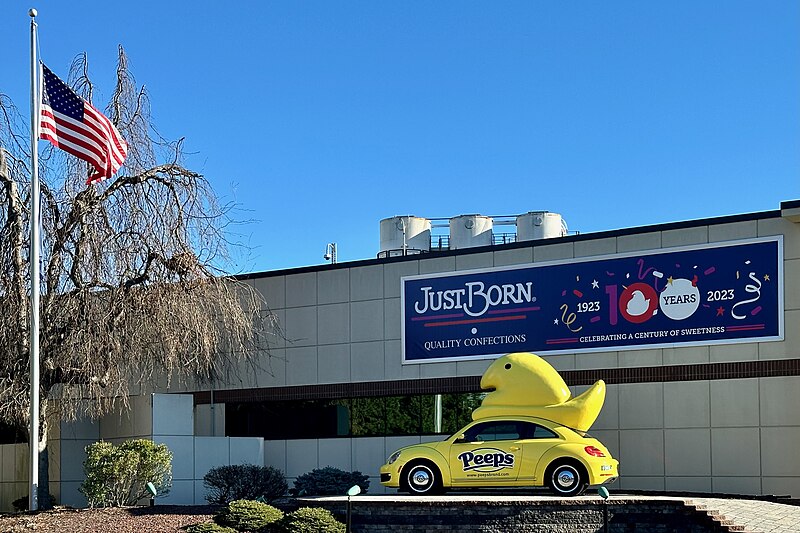 In 1953, Just Born acquired the Rodda Candy Company and its marshmallow chick line. Sam’s son, Bob Born, replaced the painstaking process of hand-forming the chicks with mass production in 1954. When founder Sam Born displayed a sign for his freshly made candy, he titled it “Just Born”, playing off of his last name and the fact that he made his candy fresh daily.