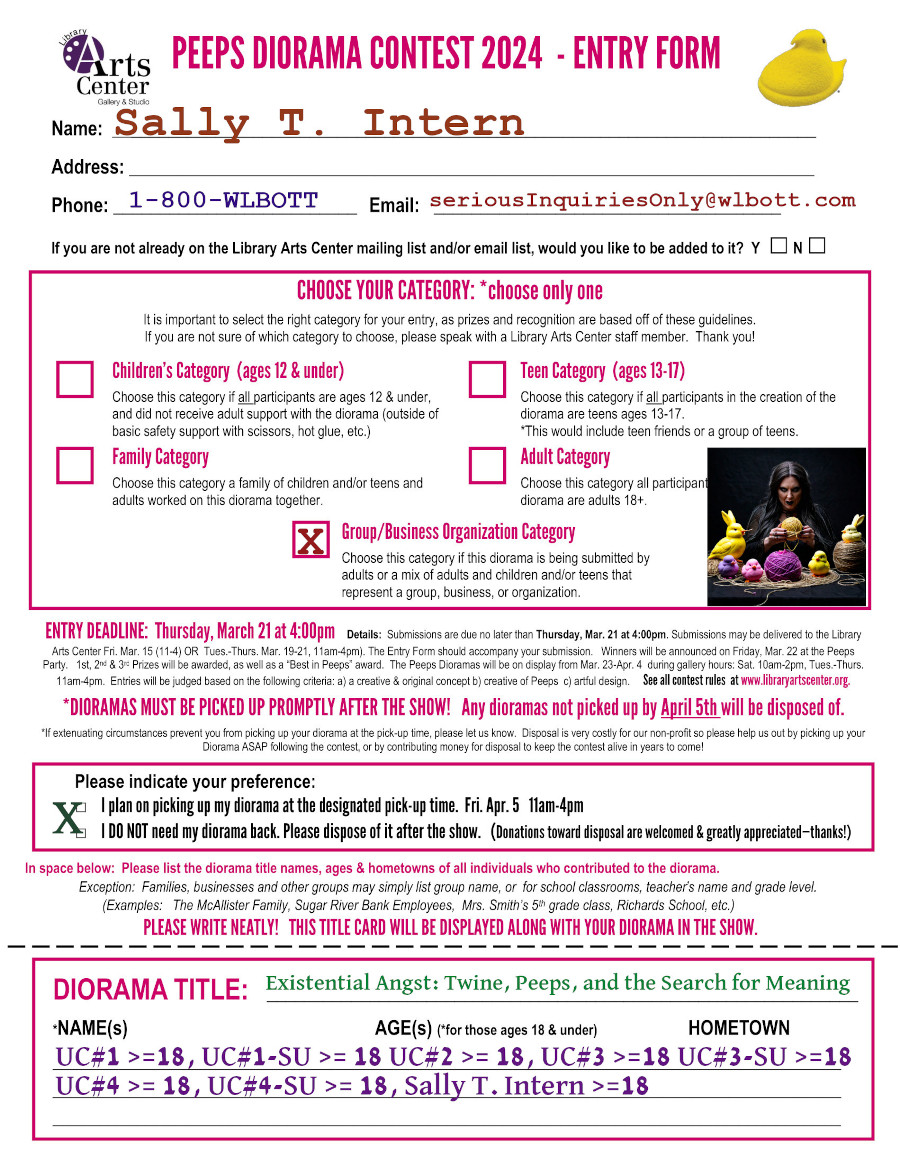 The Library Arts Center Gallery is hosting this fun, springtime tradition using the iconic Easter Candies: PEEPS! This annual favorite contest welcomes community members of all ages. Make an original shoebox-sized diorama with the iconic Easter candies—PEEPS!—as the main characters. Community members of all ages, businesses, school classrooms, groups & organizations are all encouraged to enter. Take cues from current events, pop culture, or clever “peeps” puns—just get creative!