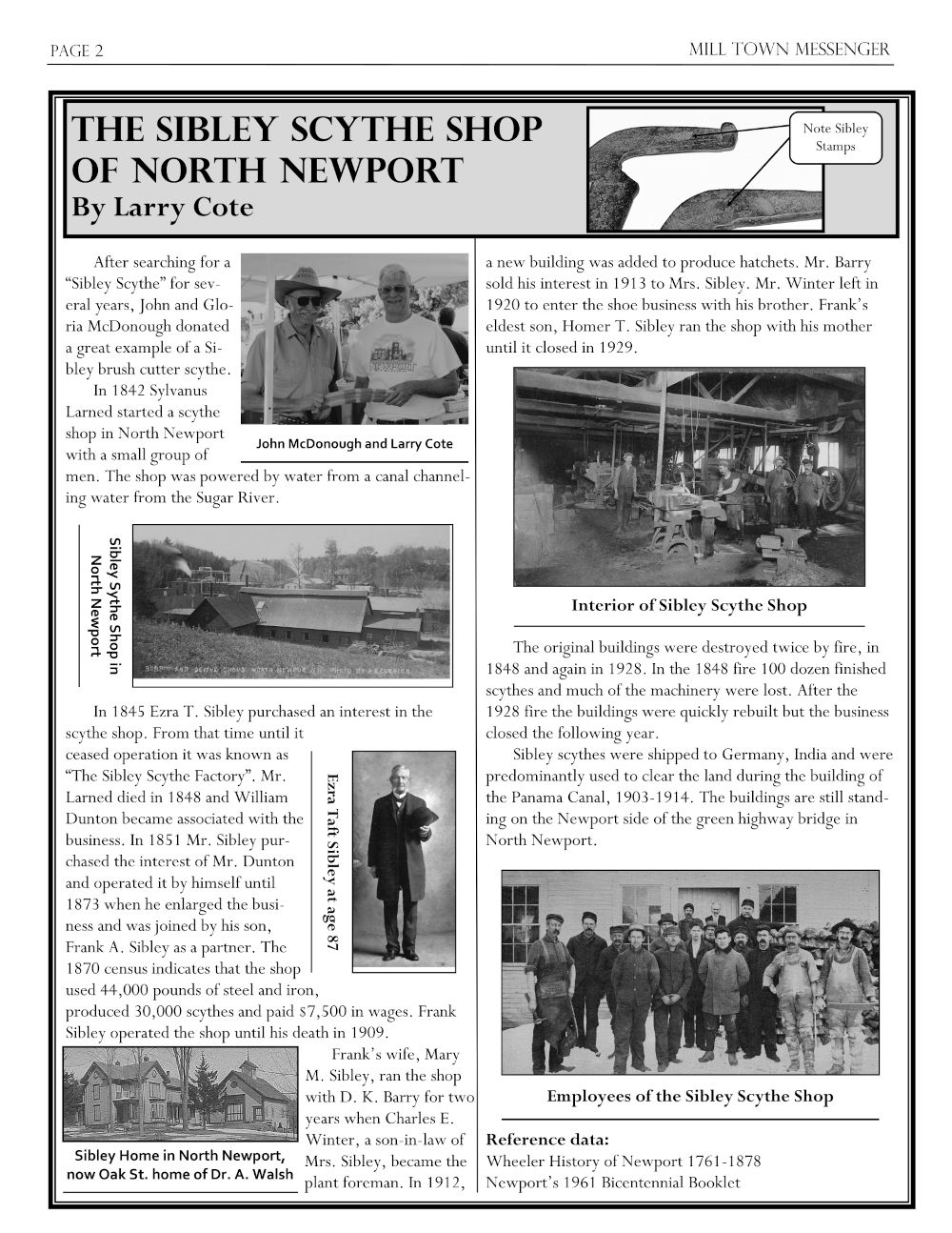 Newport Historical Society / Mill Town Messenger has a newsletter describing the history of the Sibley Scythe factory.