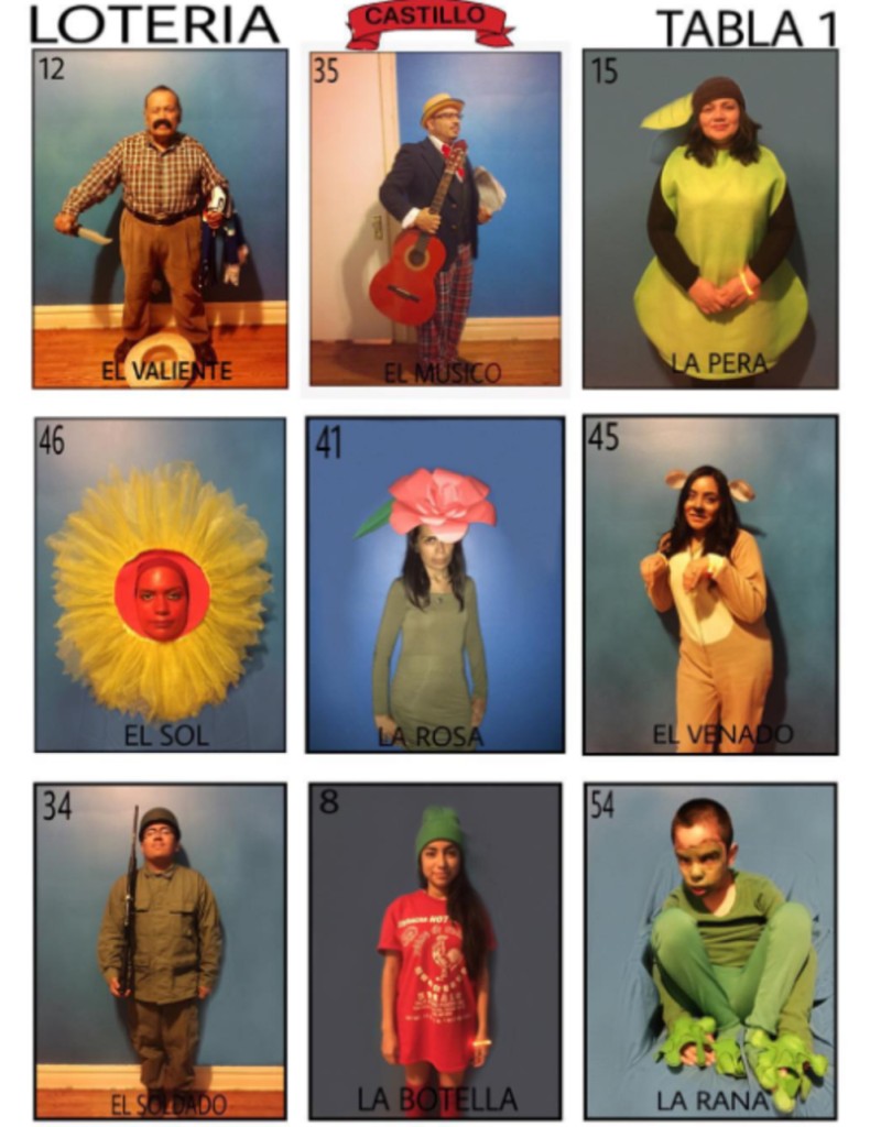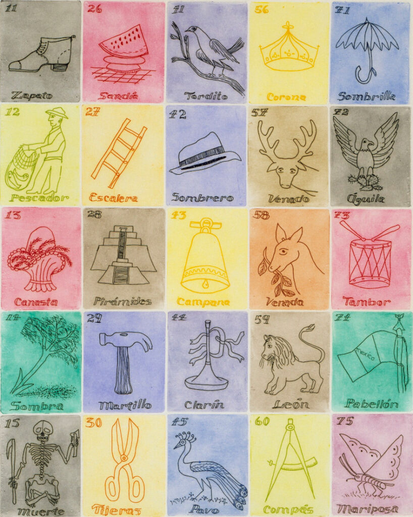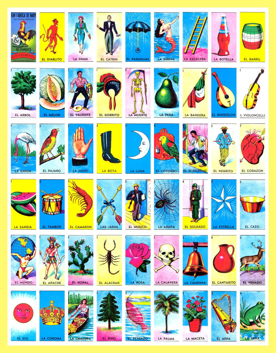 Lotería (Spanish word meaning “lottery”) is a traditional Mexican board game of chance, similar to bingo, and is played on a deck of cards instead of numbered ping pong balls. Every image has a name and an assigned number, but the number is usually ignored. Each player has at least one tabla, a board with a randomly created 4 x 4 grid of pictures with their corresponding name and number. Players choose a tabla (Spanish word for “board”) to play with, from a variety of previously created tablas, each with a different selection of images.