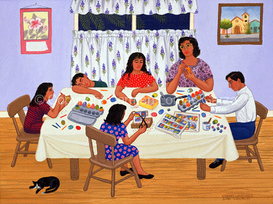 One of Ms. Garza’s painting shows a family preparing cascarones – a fun Easter tradition in south Texas and Mexico.