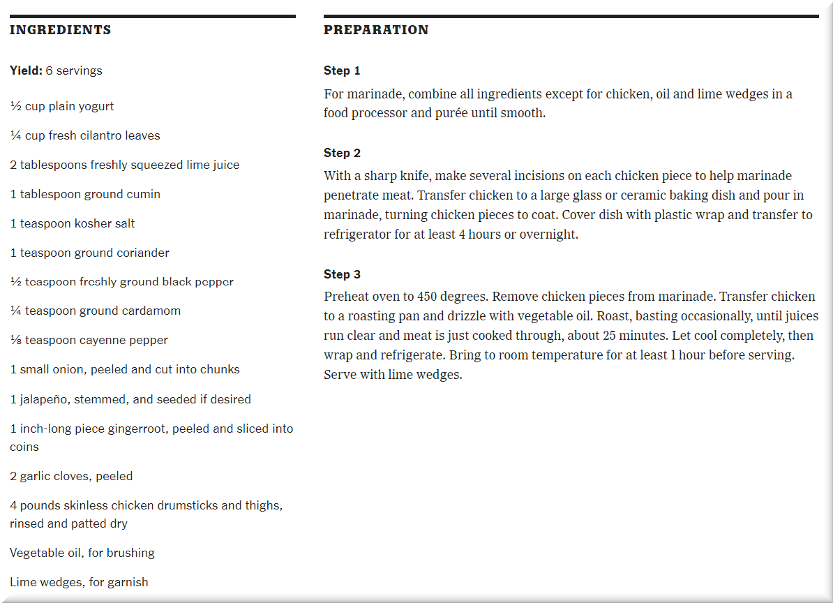 If anyone tries the Dinner cookbook, may I recommend the Faux Tandoori Chicken recipe, which Mr. KM[1] requests weekly. I don’t even like Indian food that much, but I’m obsessed with this one.