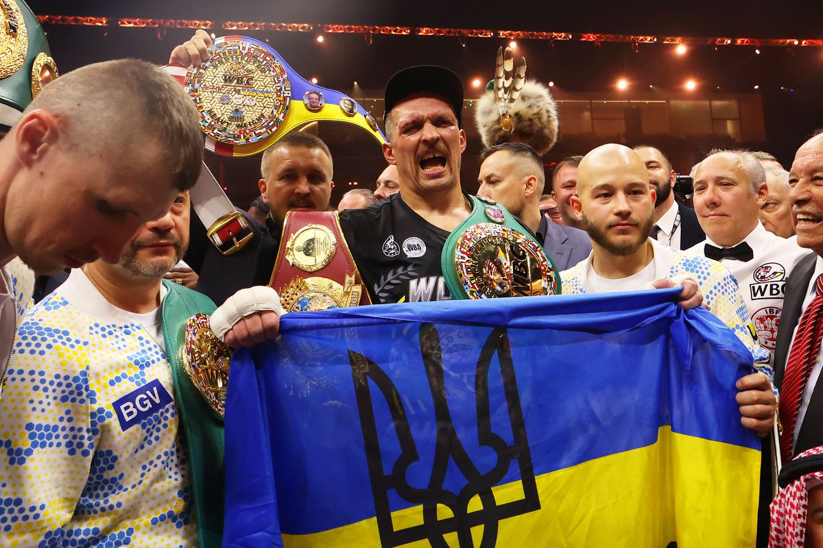 Usyk quickly joined his local territorial defence group in Kyiv, while the city was bombarded and threatened by encirclement. The following month, he received permission to leave Ukraine and train for his match with Anthony Joshua in August 2022 – for which he wore a traditional Cossack hairstyle, and afterwards raised the Ukrainian blue-and-yellow flag in victory.