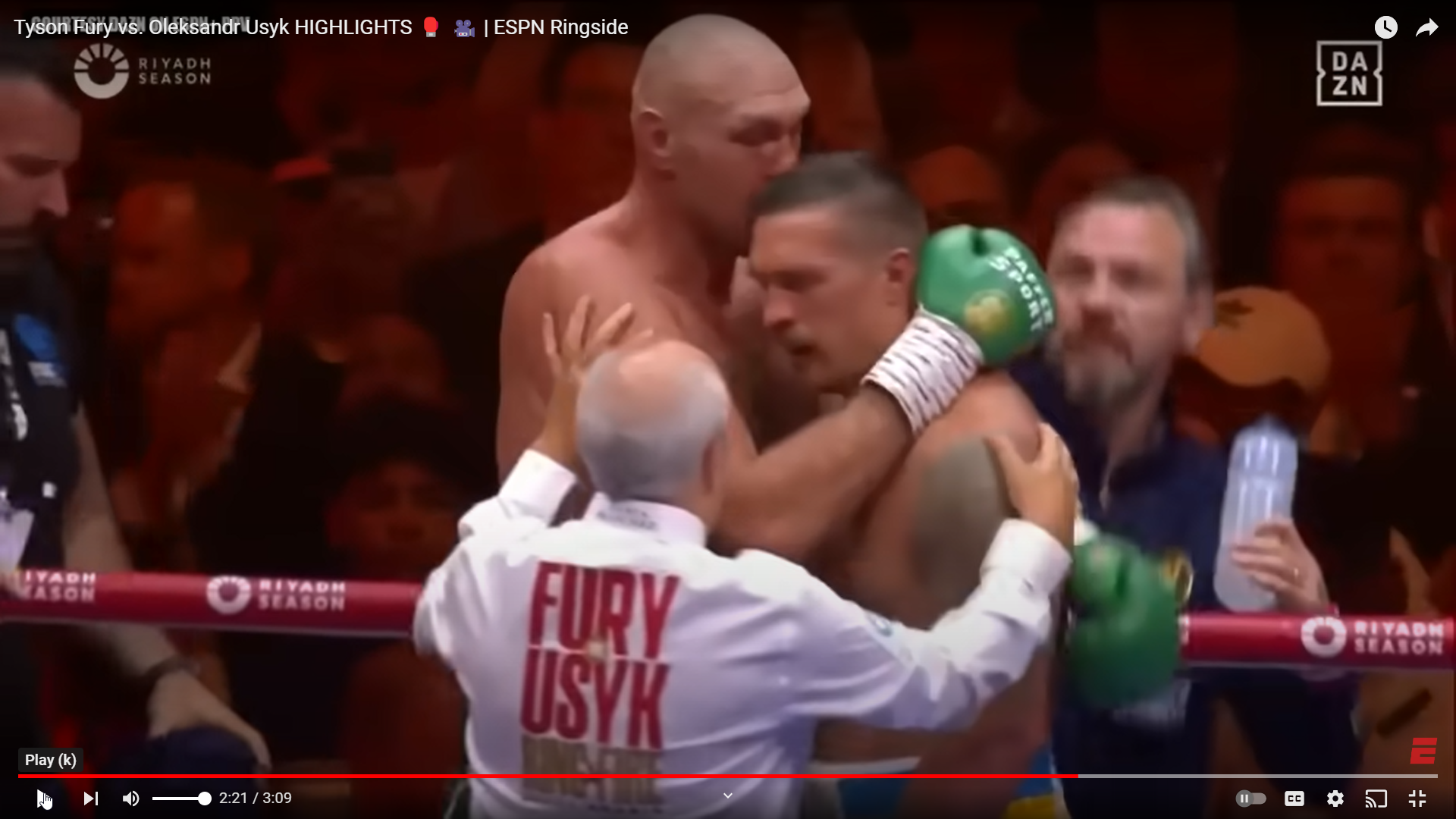 “It’s a great time. It’s a great day,” said [Oleksandr] Usyk who is 6 inches shorter than the 6-foot-9 Fury, and weighed in 30 pounds lighter. “Thank you so much to my team,” Usyk said, fighting back tears. “It’s a big opportunity for me, for my family, for my country. Slava Ukraini!“