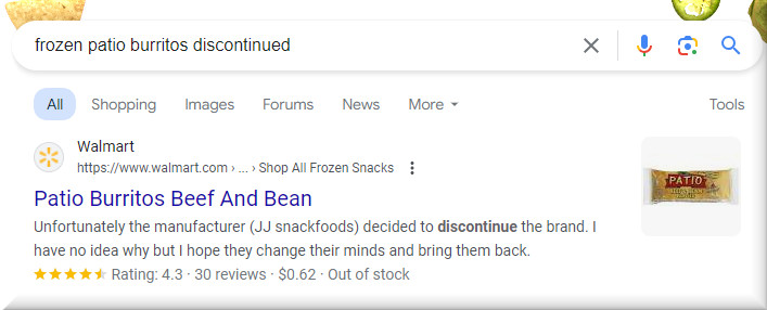 [ed. note: Patio Burritos, now apparently extinct, used to be our go-to 3 for $1 sustenance.]
