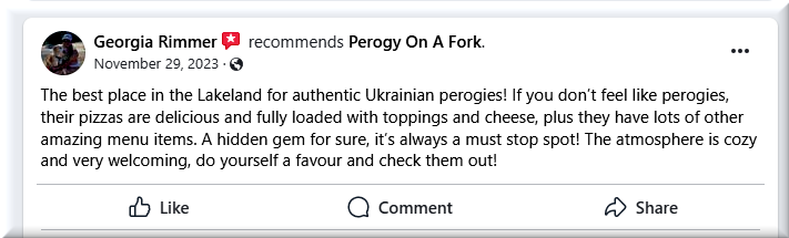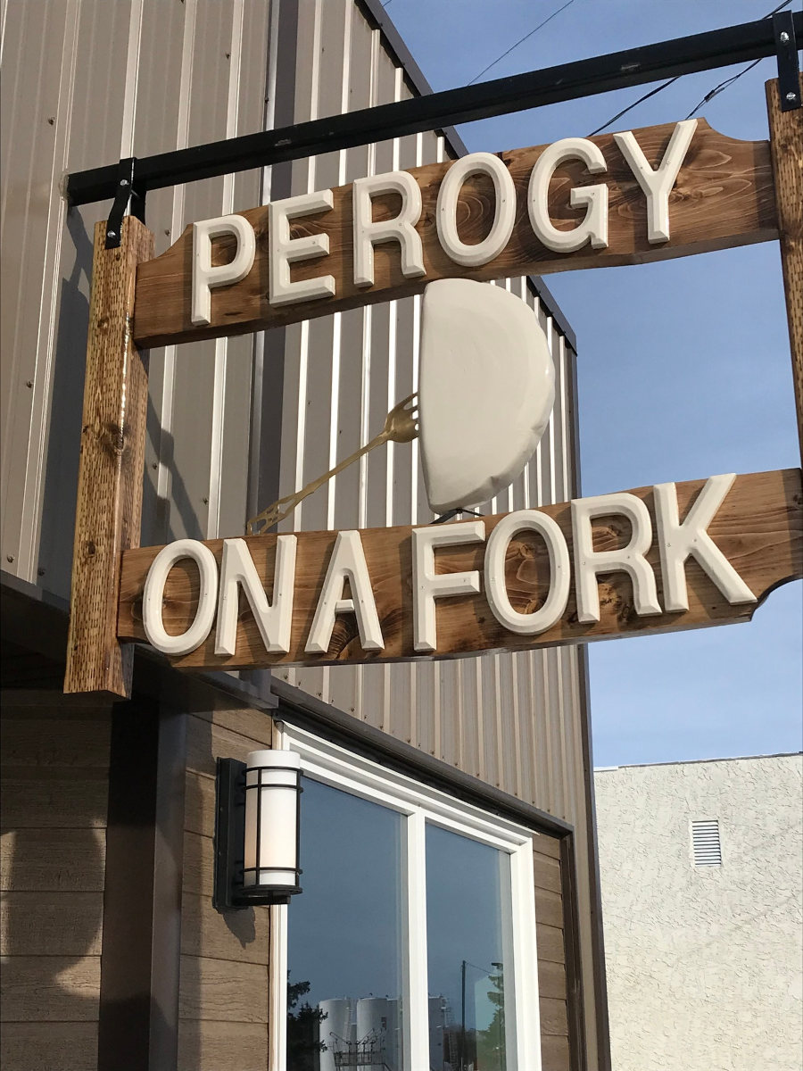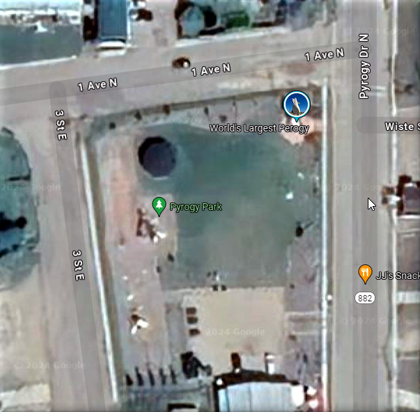 In 1993, the town unveiled its roadside tribute to the perogy. Their “Giant Perogy,” complete with fork, is 7.6 m (24.9 ft) in height. It is one of the Giants of the Prairies. Next to the roadside attraction was the Perogy Cafe, which served “Ukrainian and Chinese Perogies” it is now closed.
