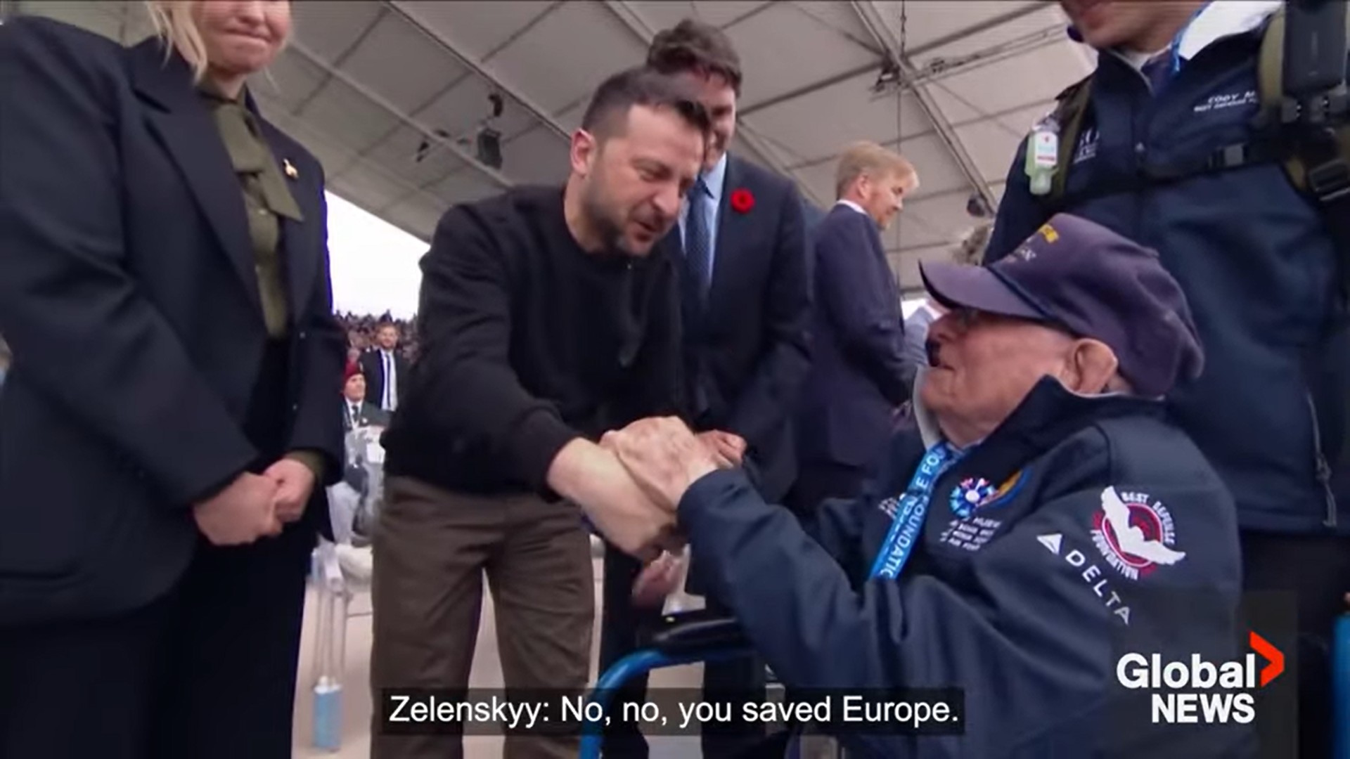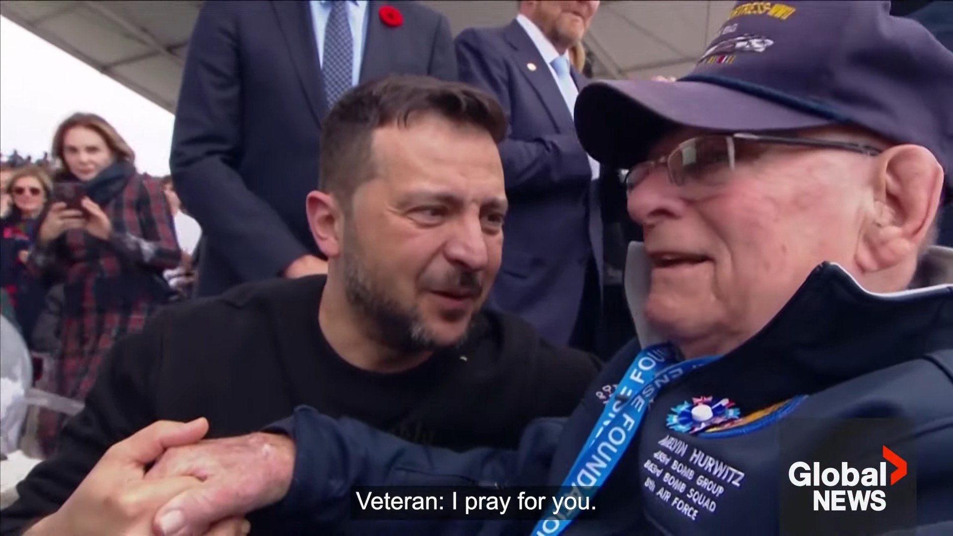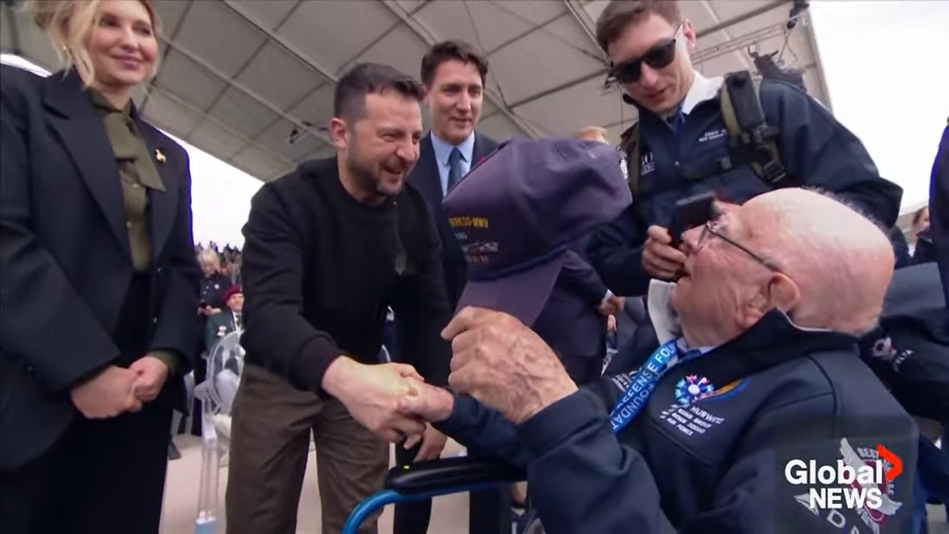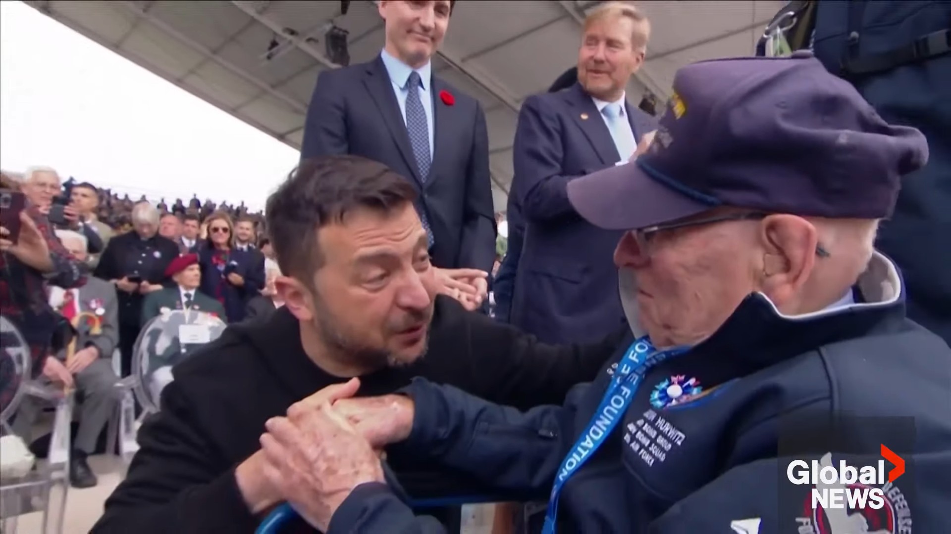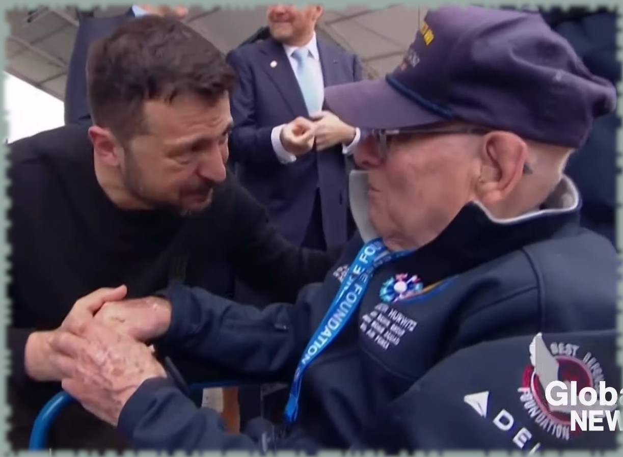 Ukrainian President Volodymyr Zelenskyy shared an emotional moment with a veteran during a D-Day ceremony in Normandy, France on Thursday.
