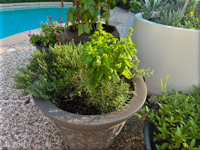 I am a lazy gardener- full sun pots hooked up to the irrigation system so they get water when I am out of town for a week or two. The thyme, basil, and rosemary survive the Houston winters, so these plants are several years old. Somehow, basil has sprouted in the white planter – I am suspecting bird transplantation by beak or poop.