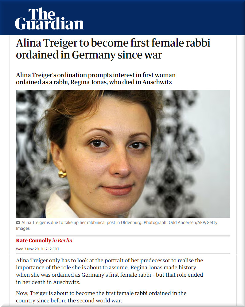As a 21-year old, after finishing her studies, she founded Beit Am, a liberal congregation in her hometown. She emigrated to Germany in 2001. In 2002, through the WUPJ, Treiger enrolled at the Abraham Geiger College of the University of Potsdam for her rabbinical studies…. Among Treiger’s inspirations was Regina Jonas, Germany’s first female rabbi, who was ordained in 1935. Treiger moved to Germany because she felt stifled by the Orthodox Jewish community in Ukraine.Germany has needed more rabbis in order to handle the influx of Soviet Jews who have emigrated to Germany since the dissolution of the Soviet Union. She works primarily with the Russian-speaking Jewish immigrants in the city of Oldenburg and the nearby town of Delmenhorst.