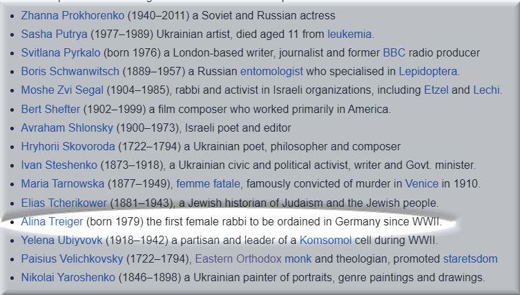 Alina Treiger (born March 8, 1979, Poltava, Ukraine) is the first female rabbi to be ordained in Germany since World War II.