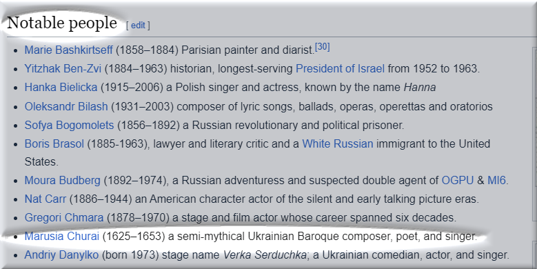 Maria or Marusia Churai (1625–1653) was a mythical Ukrainian Baroque composer, poet, and singer. She became a recurrent motif in Ukrainian literature and the songs ascribed to her are widely performed in Ukraine.