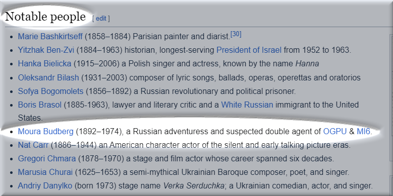 Maria Ignatievna von Budberg-Bönninghausen (February 1892 – 1 November 1974), also known as Countess von Benckendorff and Baroness von Budberg, was a Russian adventuress and suspected double agent of the Soviet Union secret police (OGPU) and the British Intelligence Service.