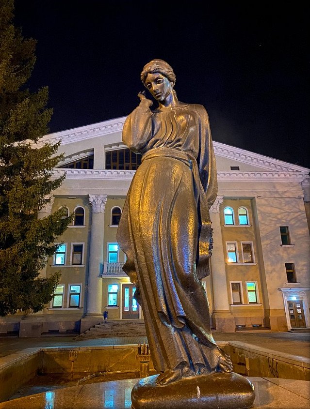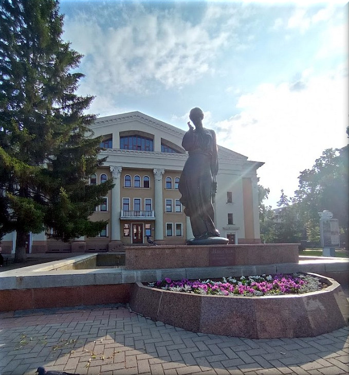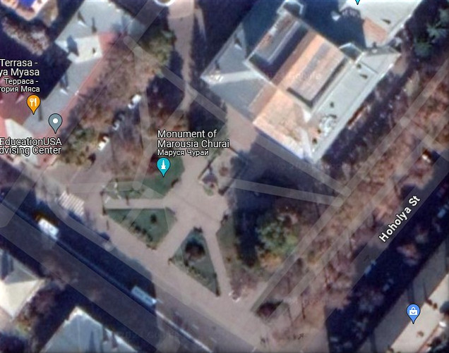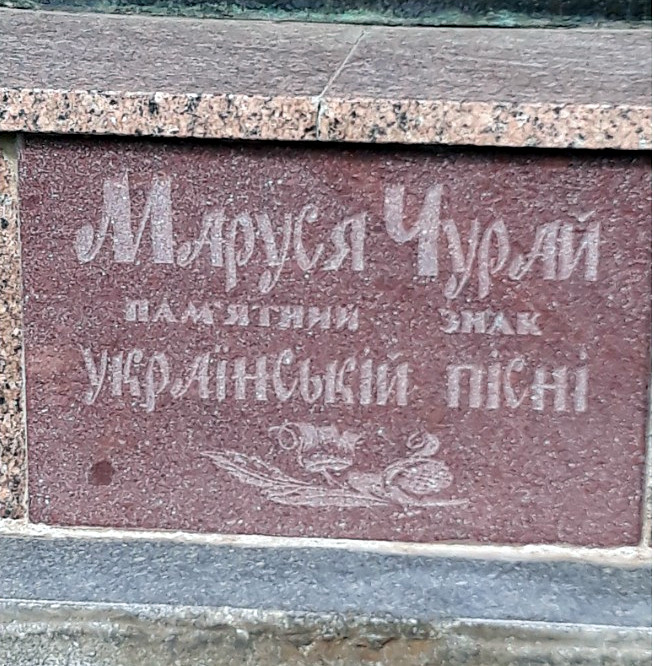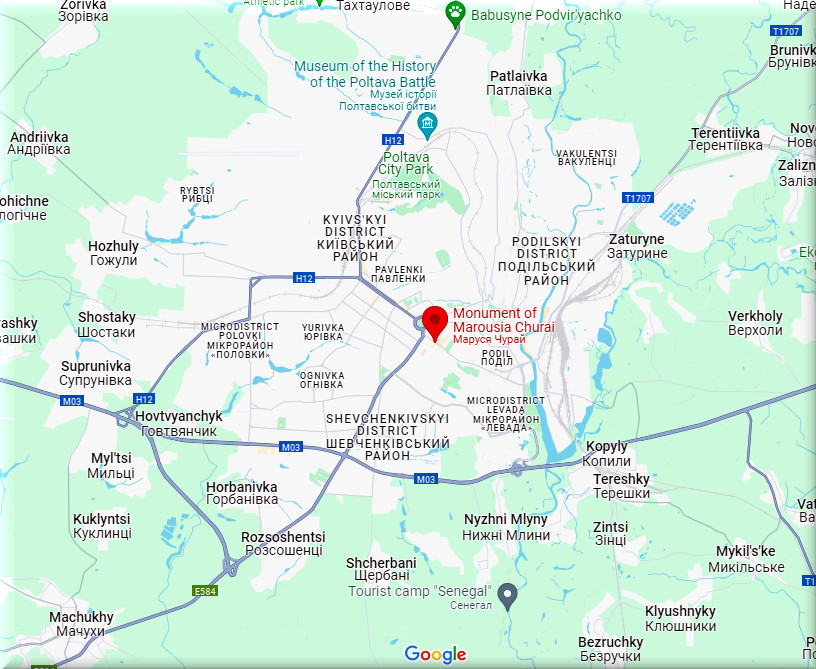 The monument devoted to the legend personality of young woman named Marusia Churai is located in the heart of Poltava – behind Gogol Drama Theater facing Nebesna Sotnia street. The monument was unveiled on April 14, 2006. Its authors are Poltava sculptors Dmytro Korshunov and Valerii Holub.