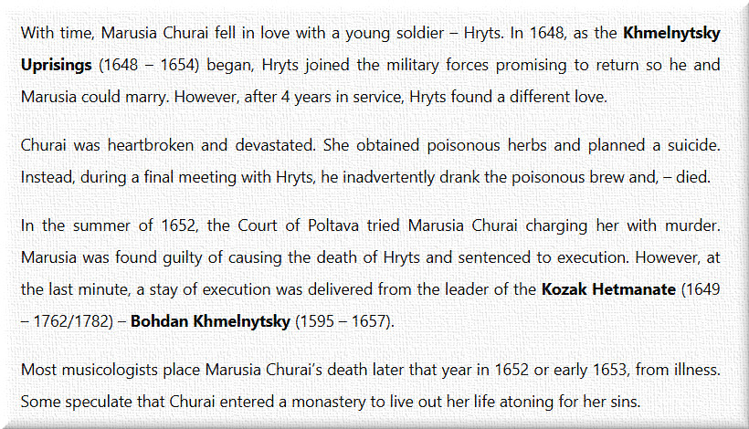 According to the legend she was a native of Poltava (then in Crown of the Kingdom of Poland), and is regarded as the purported author as well as the subject of the well-known Ukrainian folk song “Oi Ne Khody Hrytsiu Tai na Vechornytsi” (Oh Gregory, Don’t Go to the Evening Dances) known in the West as “Yes, My Darling Daughter”.