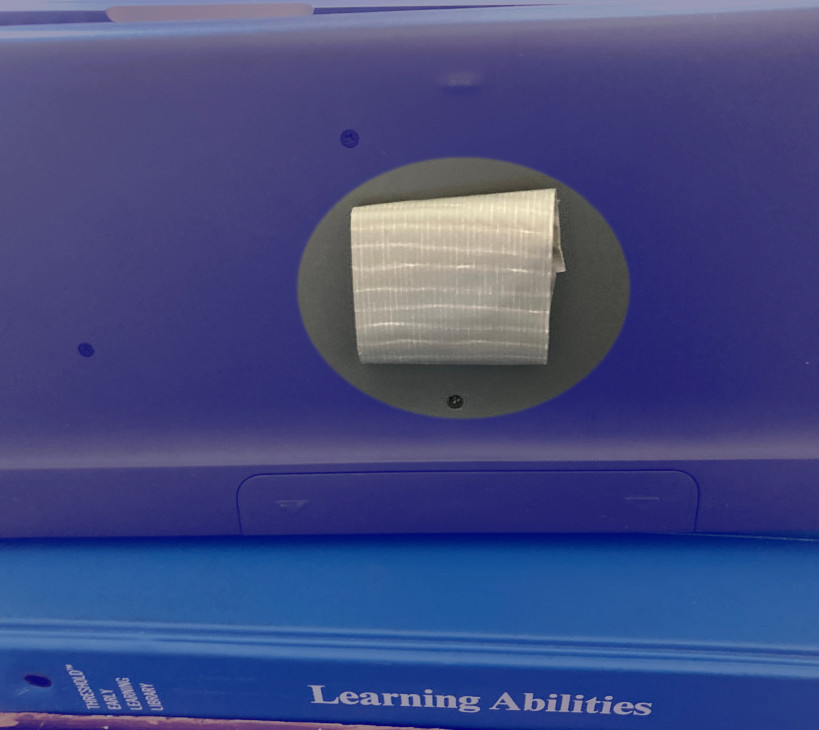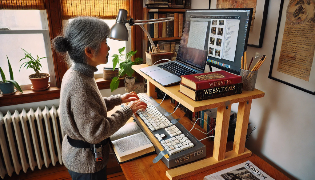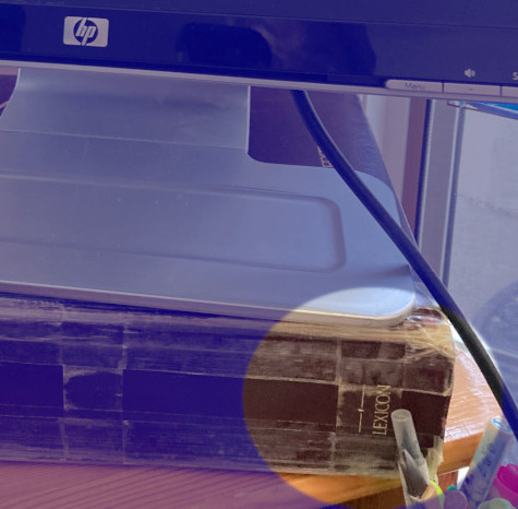 Laptop placed on top. Then I raised the extra monitor with a thick Webster dictionary. Got a spare keyboard from UC#1, propped it up on a thick book of photography, sitting on a metal stand saved from somewhere, then stationed on a wooden tabletop from an antique typewriter table. Used duct tape to secure keyboard on old looseleaf binder.