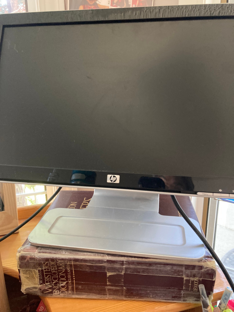 Well. I’m working on fashioning a stand-up computer desk, without going out and purchasing anything new. So, I started by clearing off a wooden desk that I have in my office, and have been using to store miscellaneous papers and pictures, and occasionally using it to write on. Then I retrieved a raised wooden stand from the basement, that I had purchased with some used furniture about 10 yr. ago, and have only ever used to store miscellaneous pieces of fabric and sewing equipment.