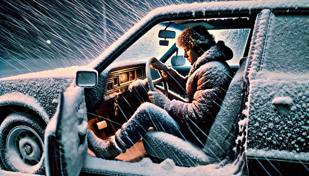 When we lived in Maryland in the late 1980’s, we had some tough winters with lots of snow and sleet. I had a crappy car and a 40 mile (64 km) commute each way to school. One evening at school, I went out to my car and the door was frozen shut. I eventually pried it open, but the door would not latch closed due to ice in the locking mechanism. So I drove home at 60 mph (100kph) holding the door closed with my right hand and steering with my left. It was a manual shift car, so this was tricky.