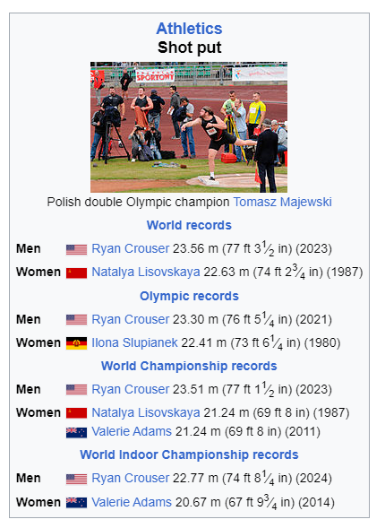 Ryan Crouser (born December 18, 1992) is an American track and field athlete who competes in the shot put and discus. He specializes in the shot put, in which he is a two-time Olympic gold medalist and a three-time World Champion. He holds the world record in the shot put, both indoors and outdoors. He set the outdoor world record at 23.56 meters in May 2023, improving upon his previous record of 23.37 m from July 2021. He has held the indoor record of 22.82 m since January 2021.