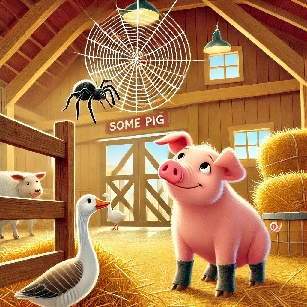 Charlotte’s Web is a book of children’s literature by American author E. B. White and illustrated by Garth Williams…. The novel tells the story of a livestock pig named Wilbur and his friendship with a barn spider named Charlotte. When Wilbur is in danger of being slaughtered by the farmer, Charlotte writes messages in her web praising Wilbur, such as “Some Pig“, “Terrific”, “Radiant”, and “Humble”, to persuade the farmer to let him live.