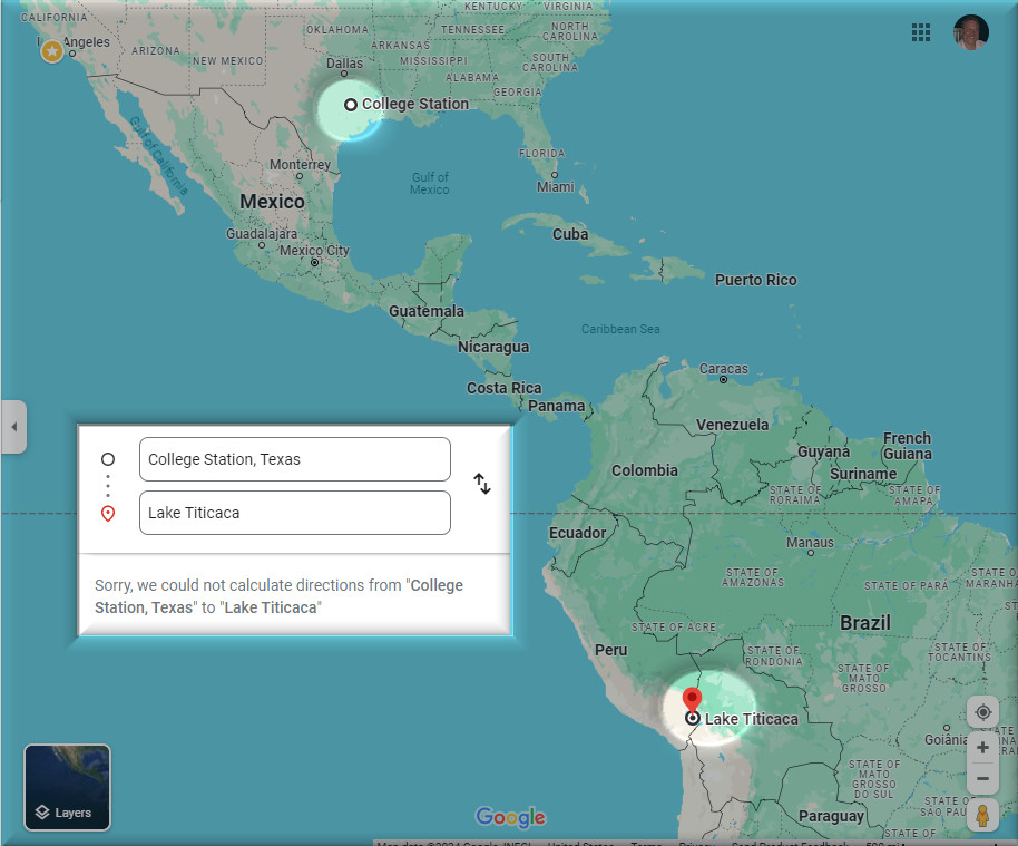 Lake Titicaca is accessible from all points on the globe, with the notable exception of College Station, Texas.