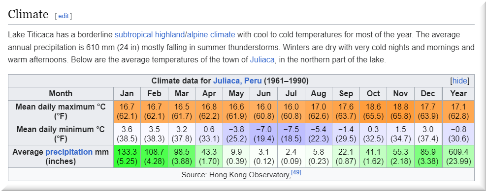 Having only a single season of free circulation, the lake is monomictic, and water passes through Lago Huiñaimarca and flows out the single outlet at the Río Desaguadero,which then flows south through Bolivia to Lake Poopó. This only accounts for about 10% of the lake’s water balance. Evapotranspiration, caused by strong winds and intense sunlight at high altitude, balances the remaining 90% of the water loss. It is nearly a closed lake.