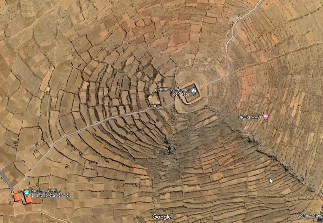 Amantani is another small island on Lake Titicaca populated by Quechua speakers. About 4,000 people live in 10 communities on the roughly circular 15 km2 (6 sq mi) island. Two mountain peaks, called Pachatata (Father Earth) and Pachamama (Mother Earth) and ancient ruins are on the top of both peaks. The hillsides that rise up from the lake are terraced and planted with wheat, potatoes, and vegetables. Most of the small fields are worked by hand. Long stone fences divide the fields, and cattle and sheep graze on the hillsides.