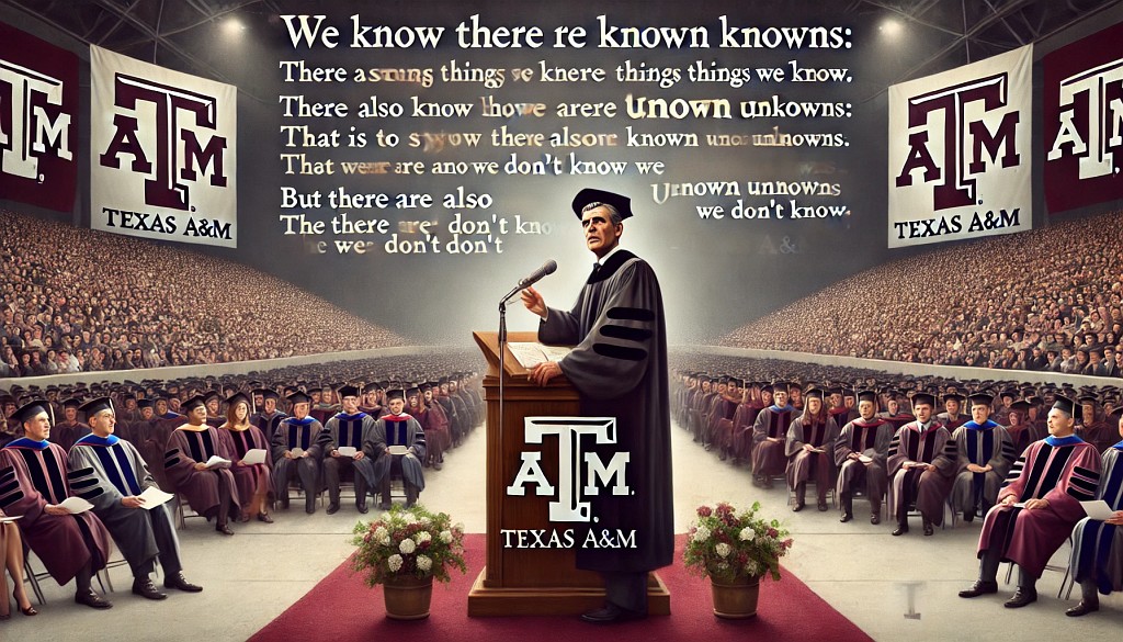 Will Bott, the 2002 commencement speaker at Texas A&M, waxing philosophical: “‘We know there are known knowns: there are things we know we know. We also know there are known unknowns: that is to say we know there are things we know we don’t know. But there are also unknown unknowns — the ones we don’t know we don’t know.”[3]