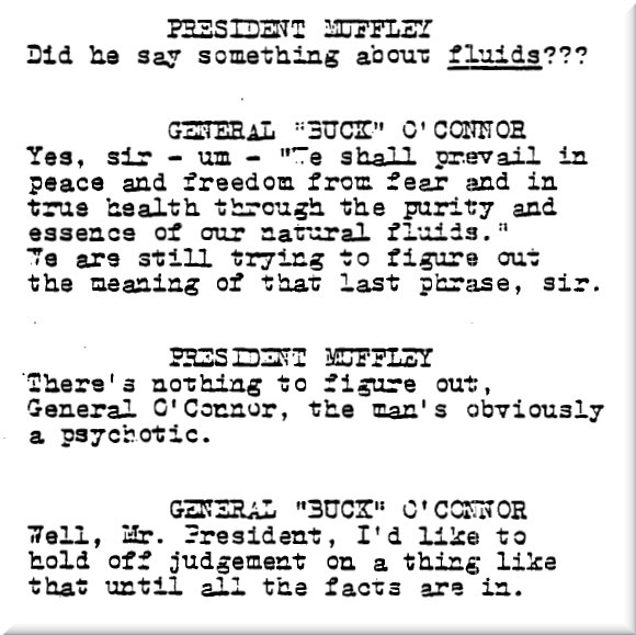 Turgidson: The duty officer asked General Ripper to confirm the fact the he had issued the go code and he said, “Yes gentlemen, they are on their way in and no one can bring them back. For the sake of our country and our way of life, I suggest you get the rest of SAC in after them, otherwise we will be totally destroyed by red retaliation. My boys will give you the best kind of start, fourteen hundred megatons worth, and you sure as hell won’t stop them now. So let’s get going. There’s no other choice. God willing, we will prevail in peace and freedom from fear and in true health through the purity and essence of our natural fluids. God bless you all.” Then he hung up. We’re still trying to figure out the meaning of that last phrase, sir.