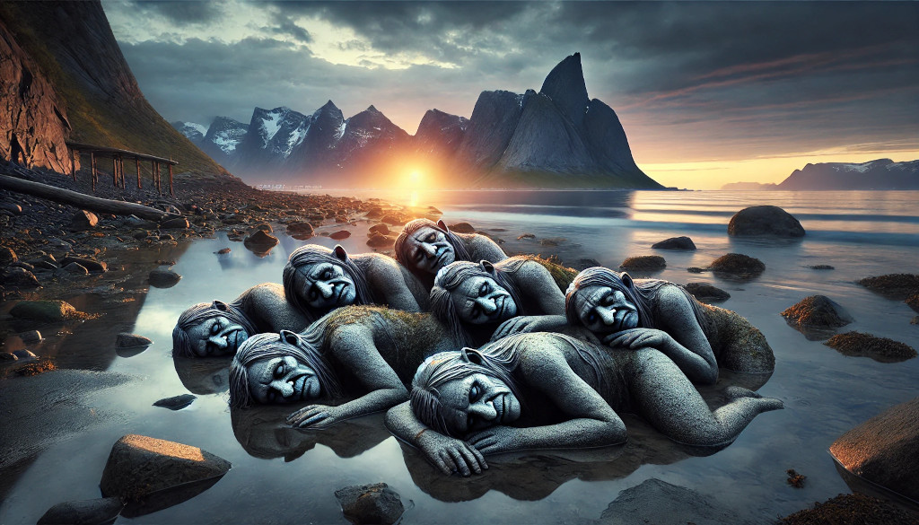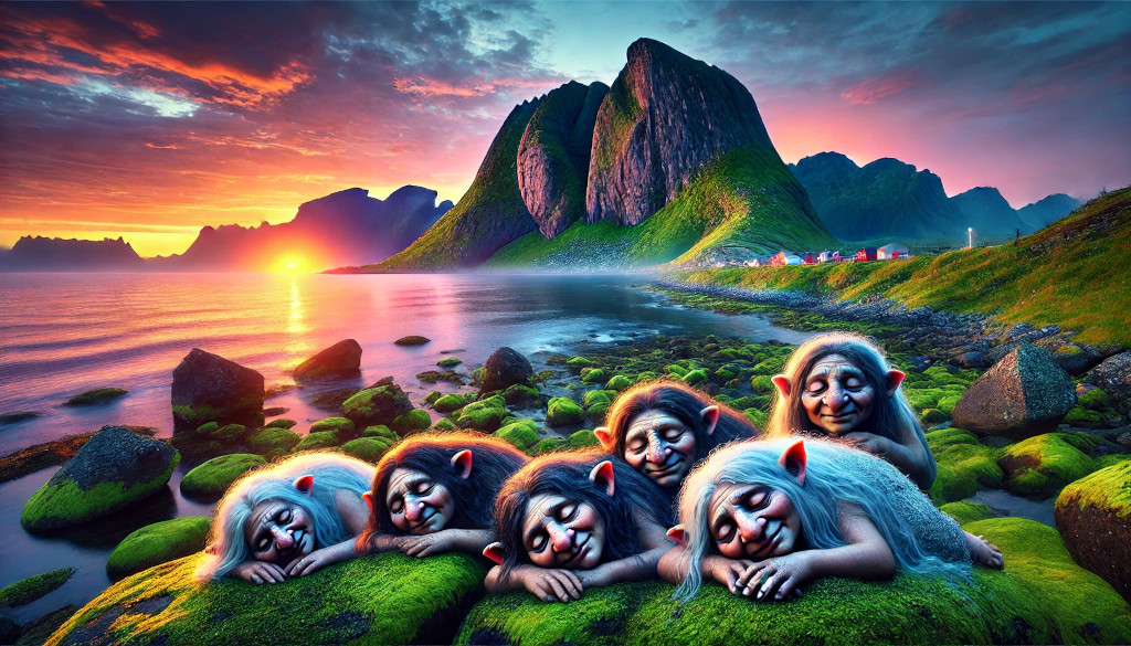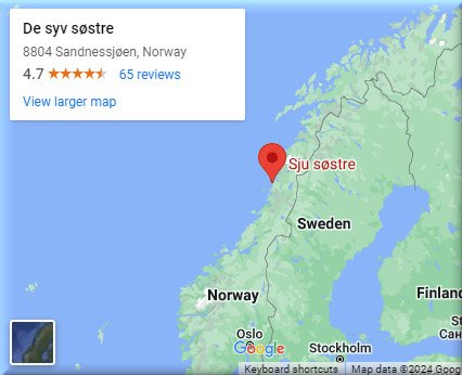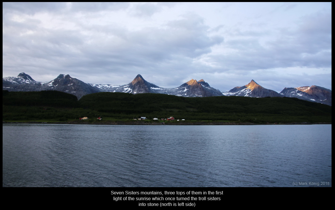 The Nordland Saga tells a legend which includes some of today’s rock formations in Nordland such as Hestmannen and Torghatten. As often there are several versions of an old legend, e.g one version and another version. Both versions have in common that the seven sisters were trolls and took a rest at their today’s location. There they were surprised by the first sunshine or morning’s dawn and transformed into mountains.